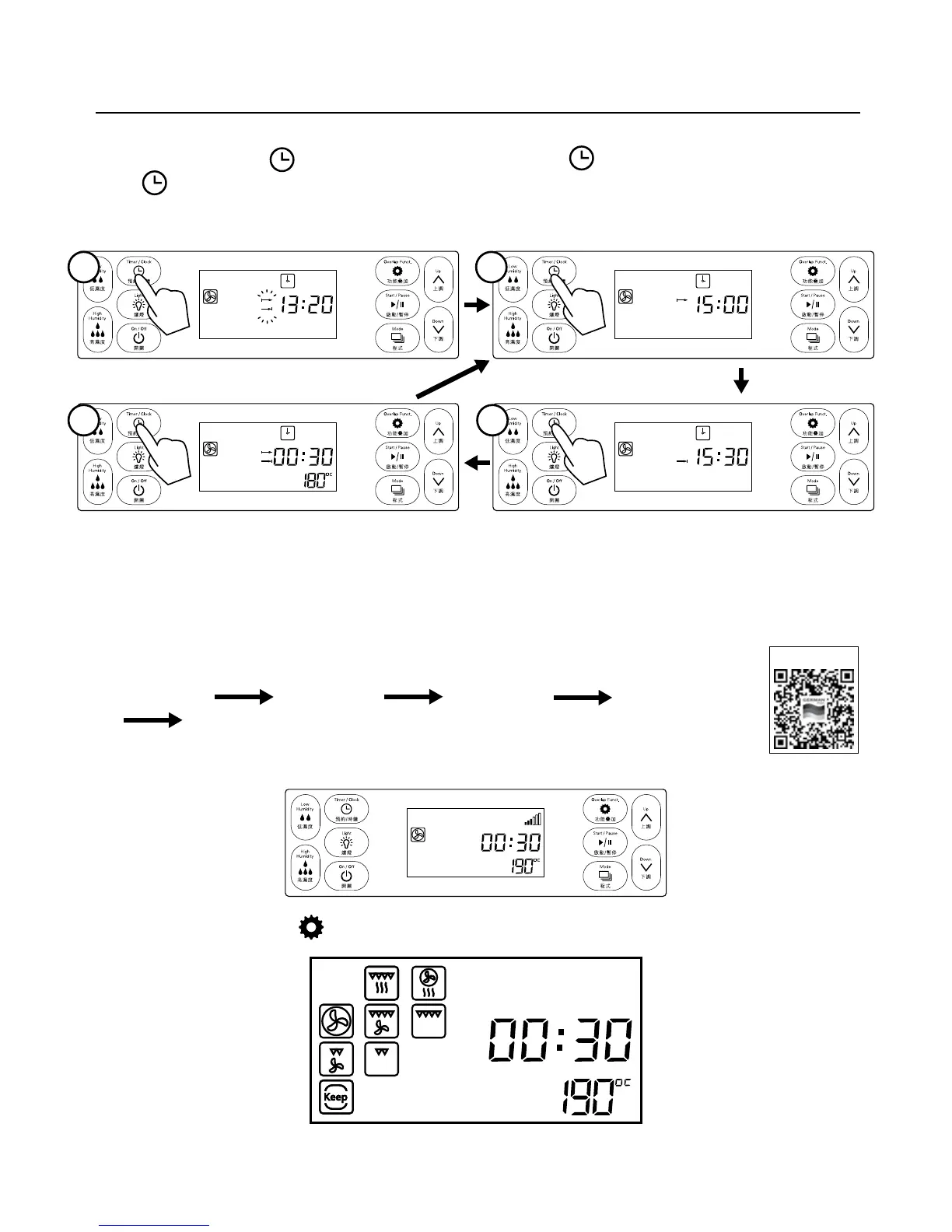 預約功能啟動後,按 時鐘鍵顯示預約啟動工作時間,再 時鐘鍵顯示預約烹調結束時間,