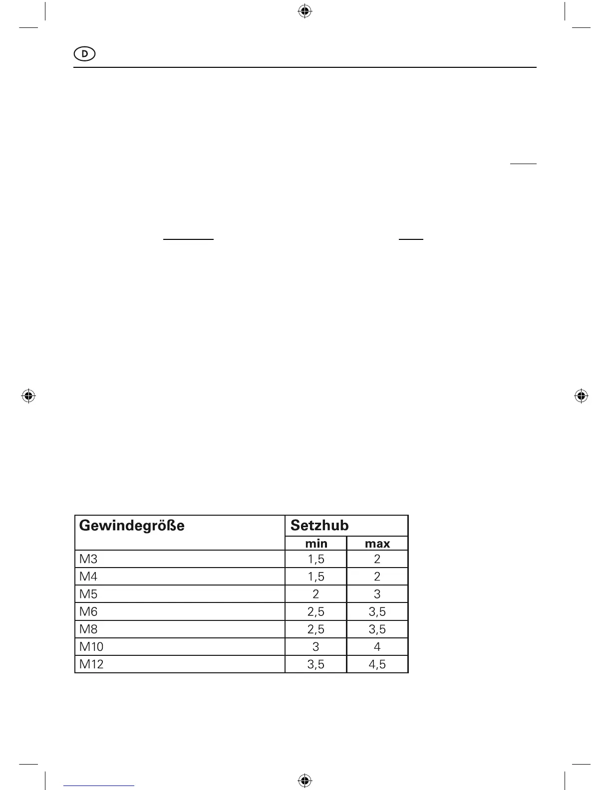 Die Werte für den Setzhub in der folgenden Tabelle sind lediglich Richtwerte und stark abhängig