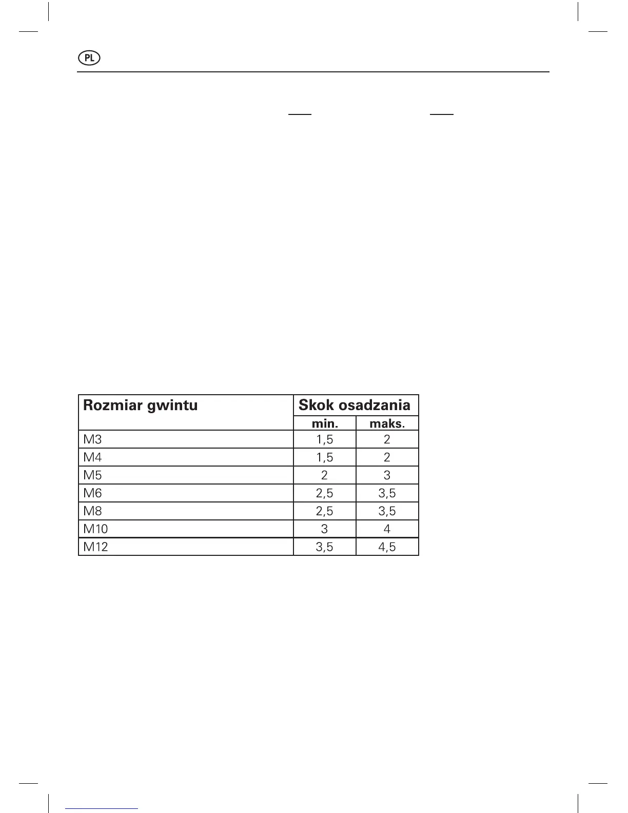 Podane w tabeli wartości skoku osadzania są wartościami orientacyjnymi i zależnymi od