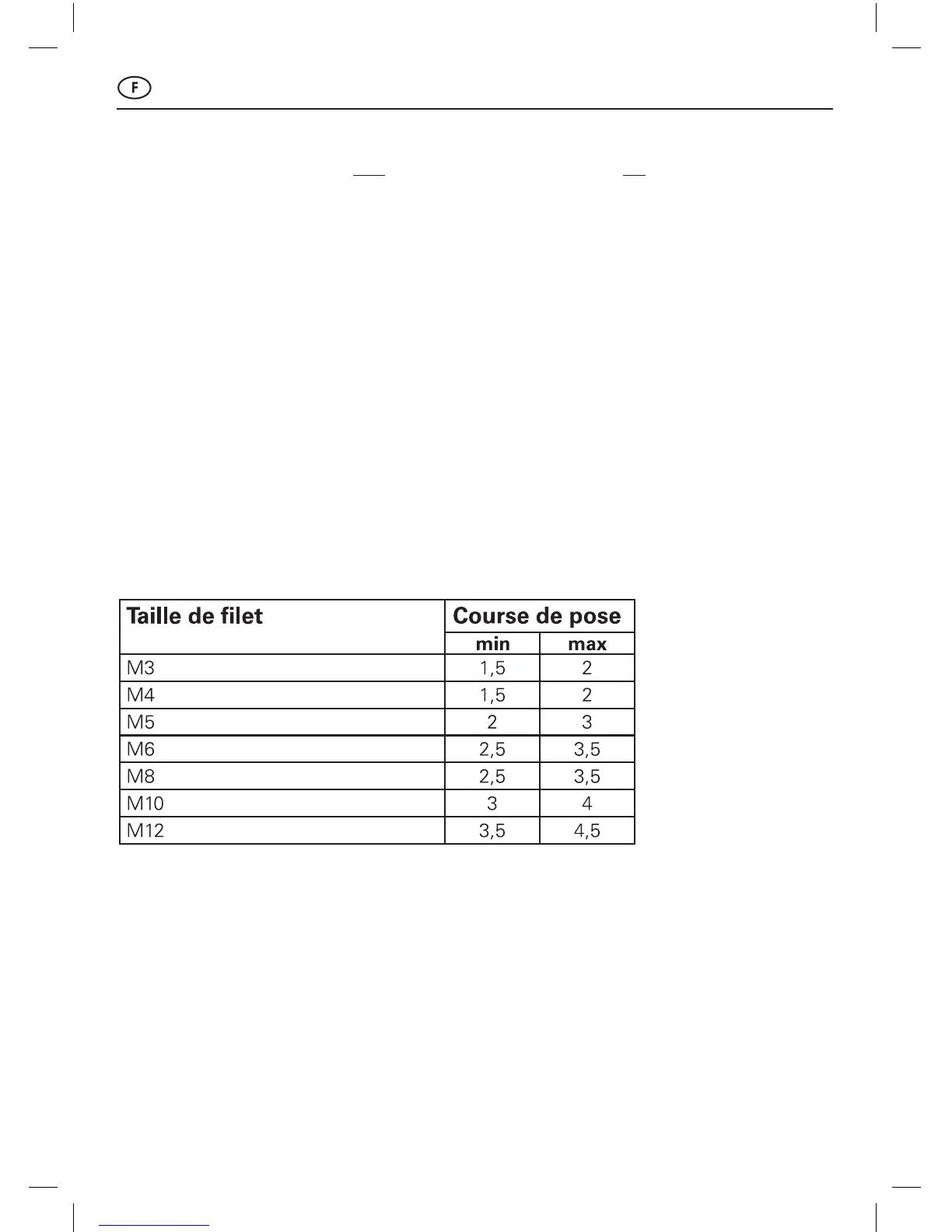 Les valeurs de course de pose du tableau suivant sont uniquement des valeurs directrices qui dépendent