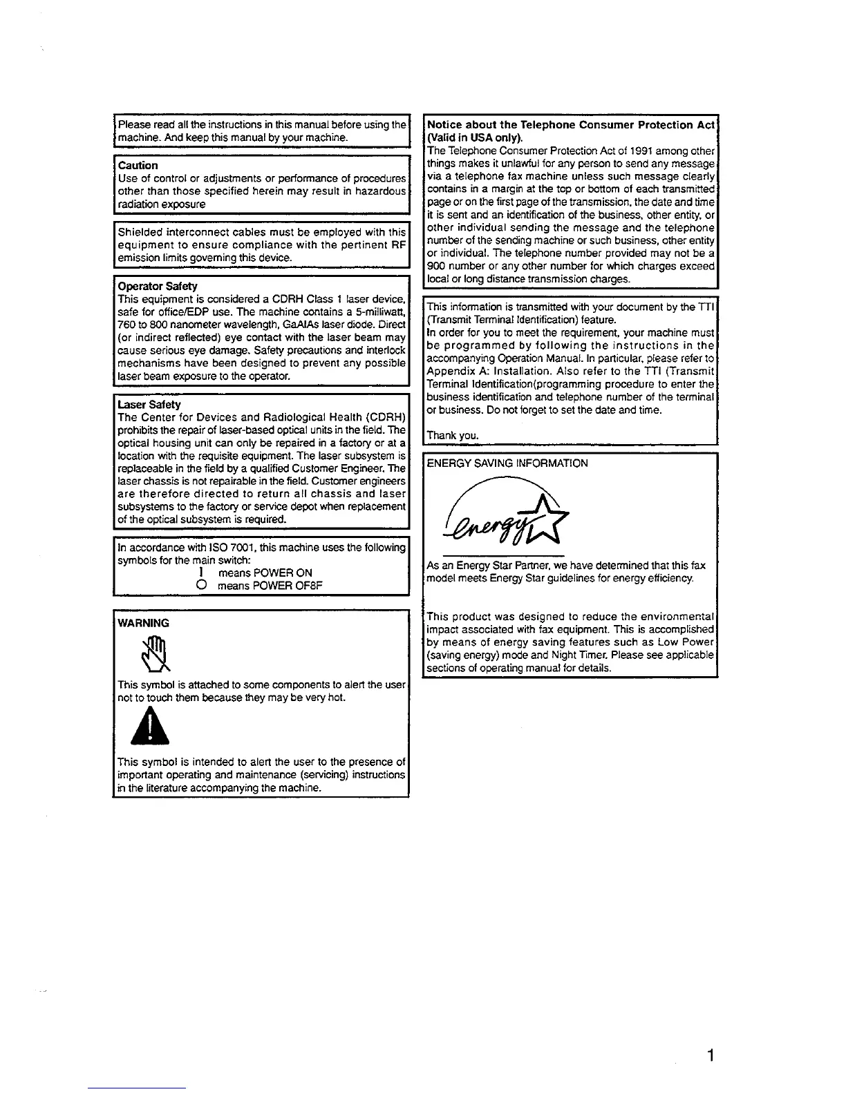 Gestetner 4210 - Safety Precautions and Guidelines; Operator and Laser Safety; Energy Saving Information