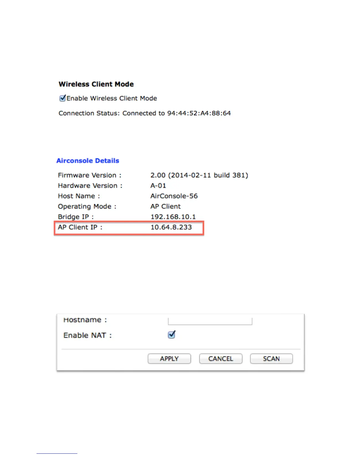 Also on the Airconsole Home (Status) page the IP Address allocated to the AP Client