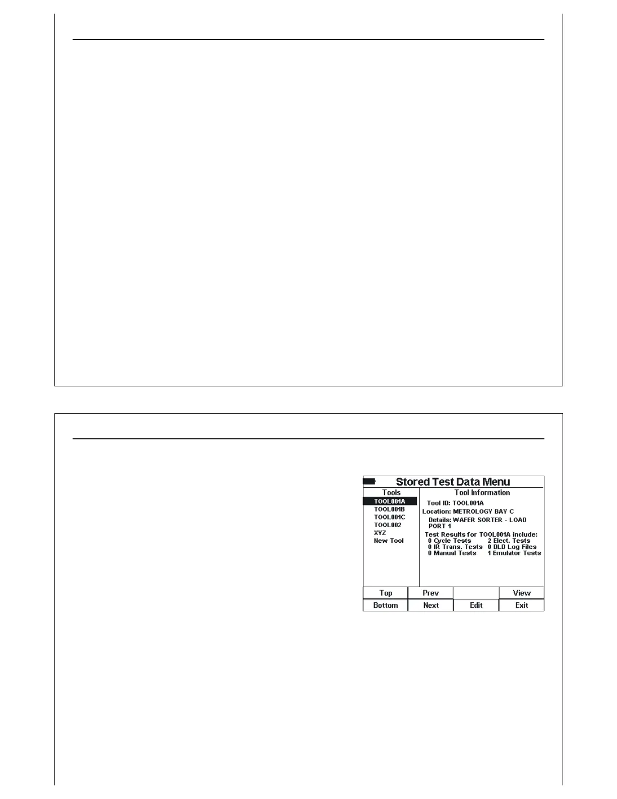 Figure 39 shows an example of the Stored Test Data Menu. The currently selected Tool ID is TOOL001A.