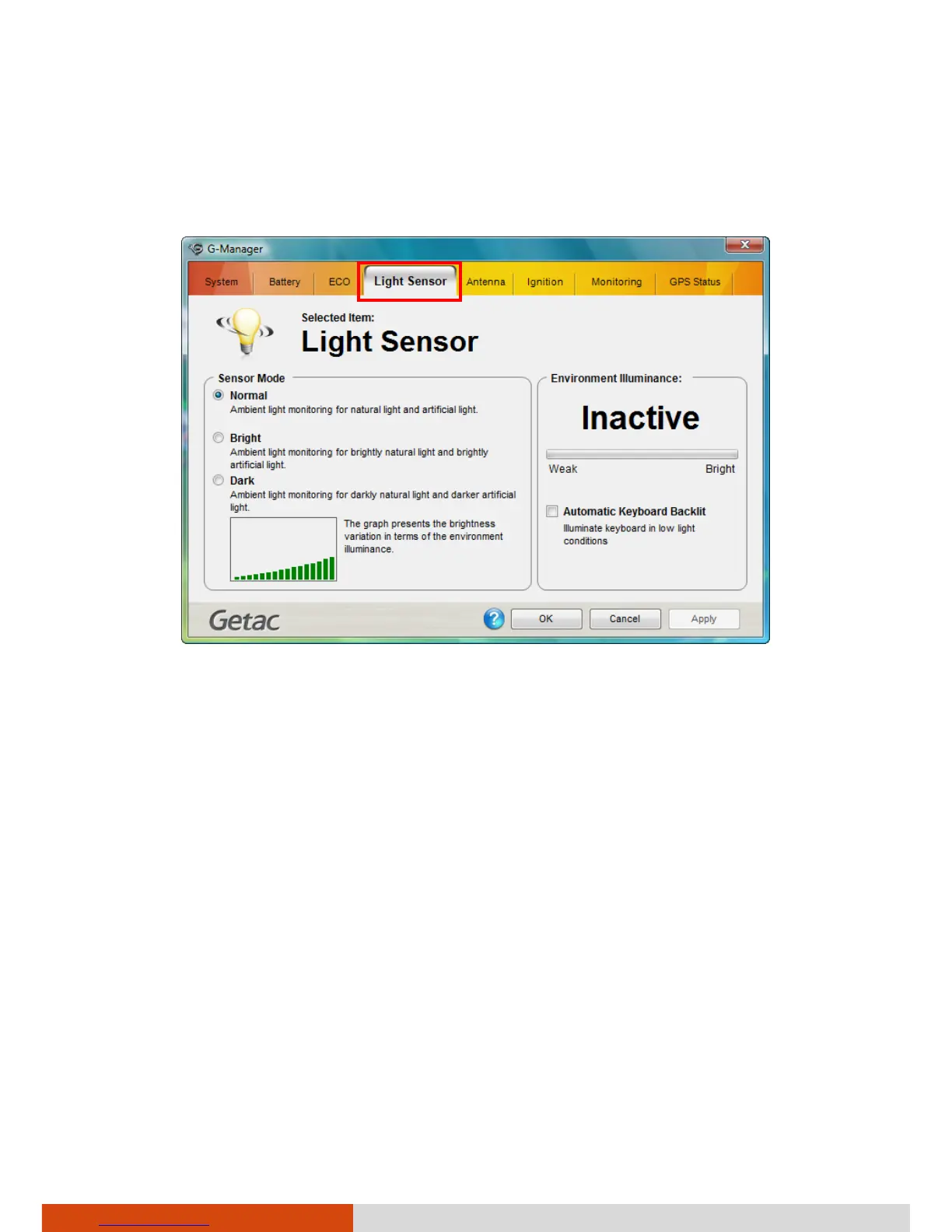 Bright – Light sensor sensitivity is set at bright environment lighting