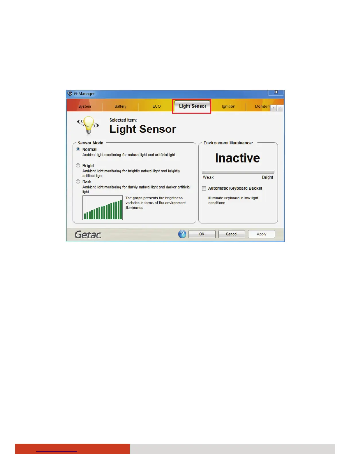 The Light Sensor tab allows you configure how the light sensor works.