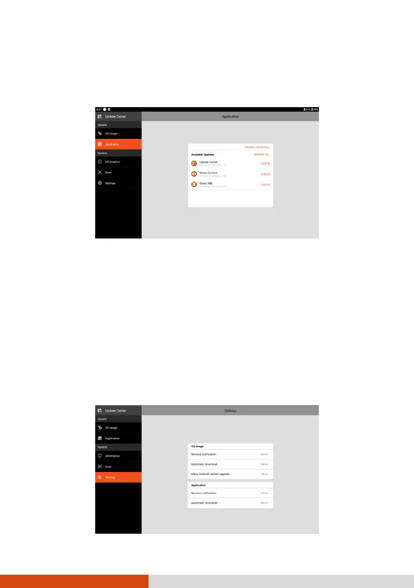 After opening Update Center, tap Application. The information you see