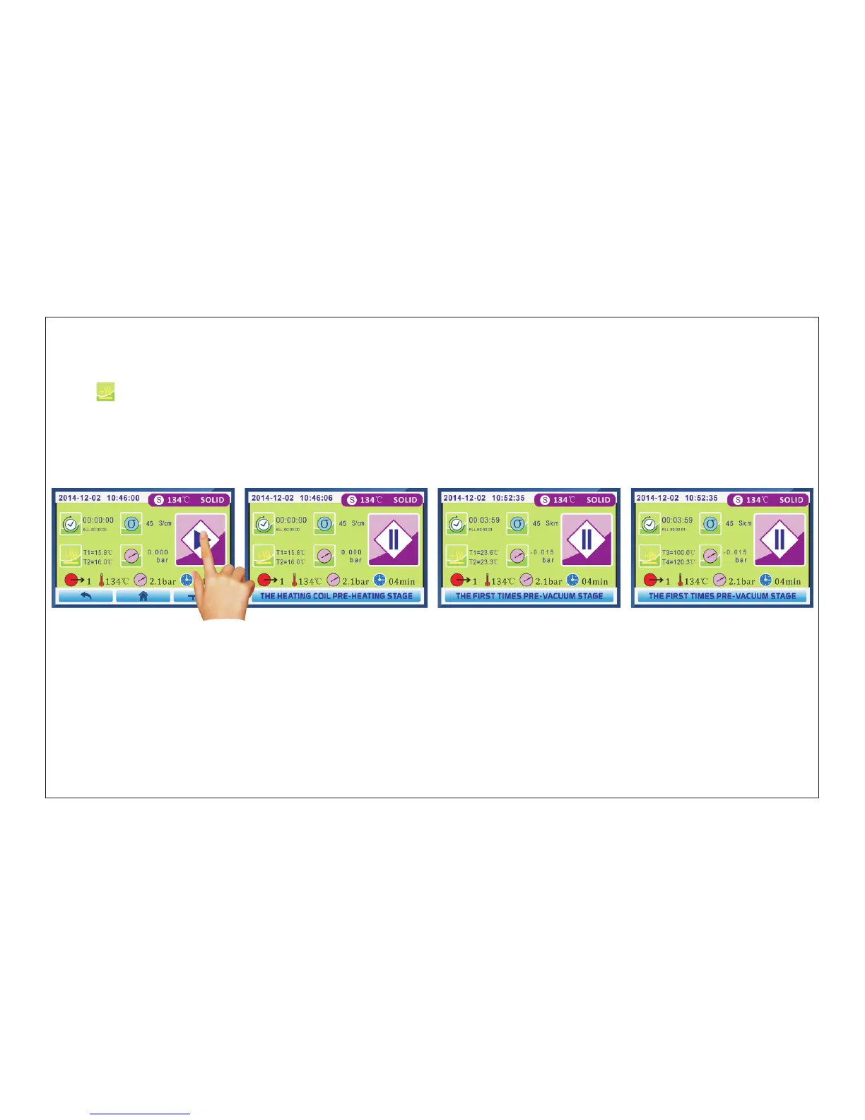 When temperature of heating coil(T3) rised and over than 100℃,screen will show Fig.5.3-21 interface (the first times pre-vacuum stage).