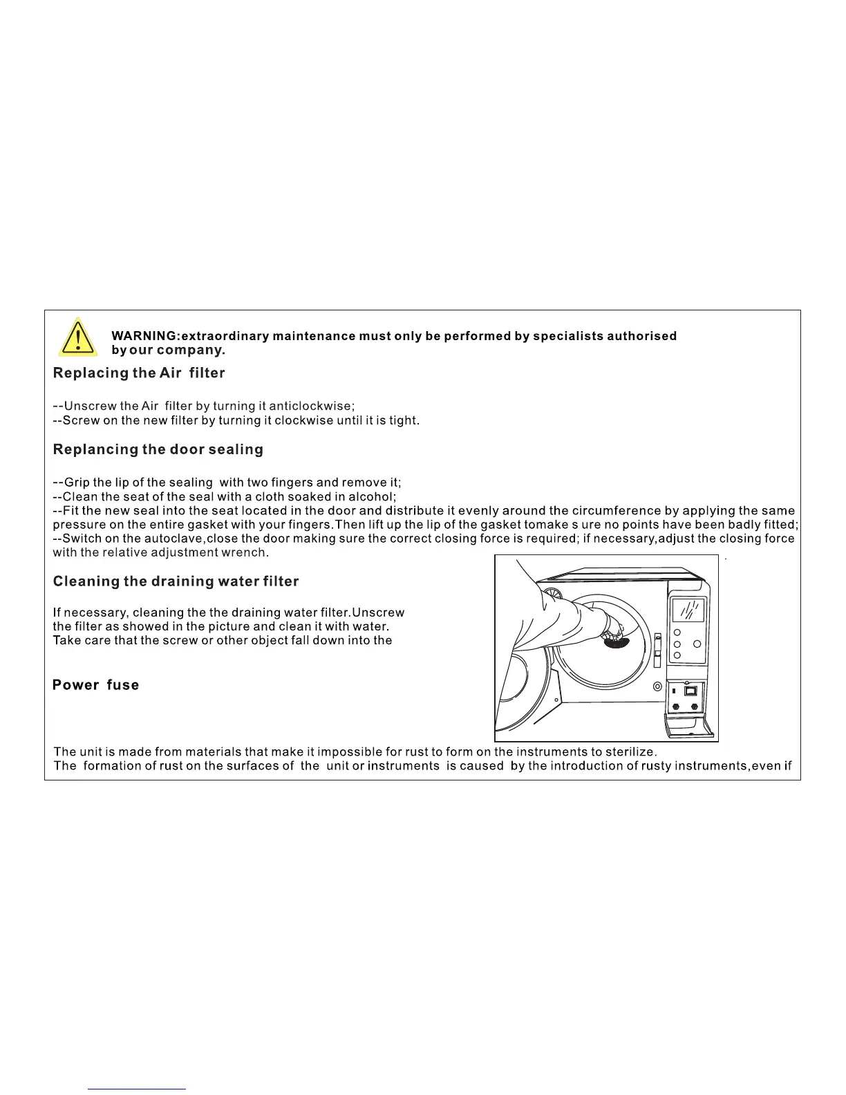 Getidy JN-23 - Replacing the Air Filter; Replacing the Door Sealing; Cleaning the Draining Water Filter; Power Fuse