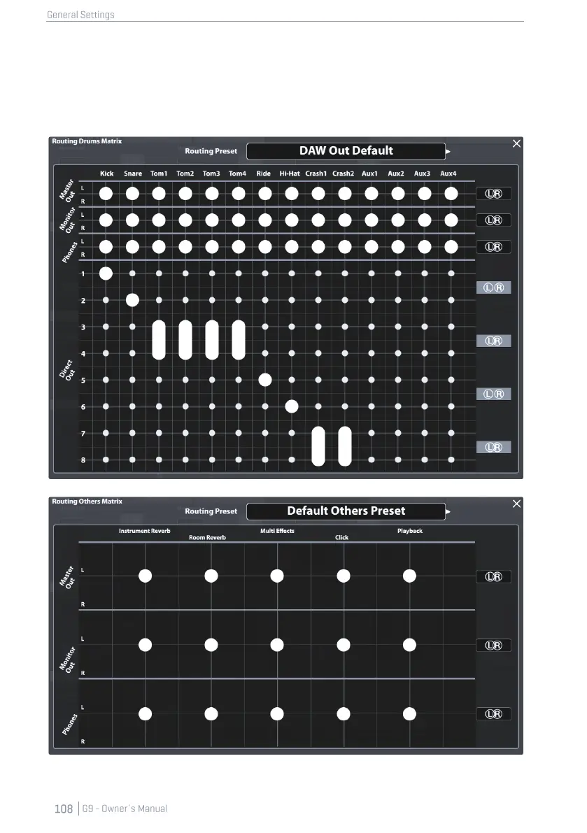 The G9´s routing function is divided into 2 input categories: Routing Drums and Routing Others. While