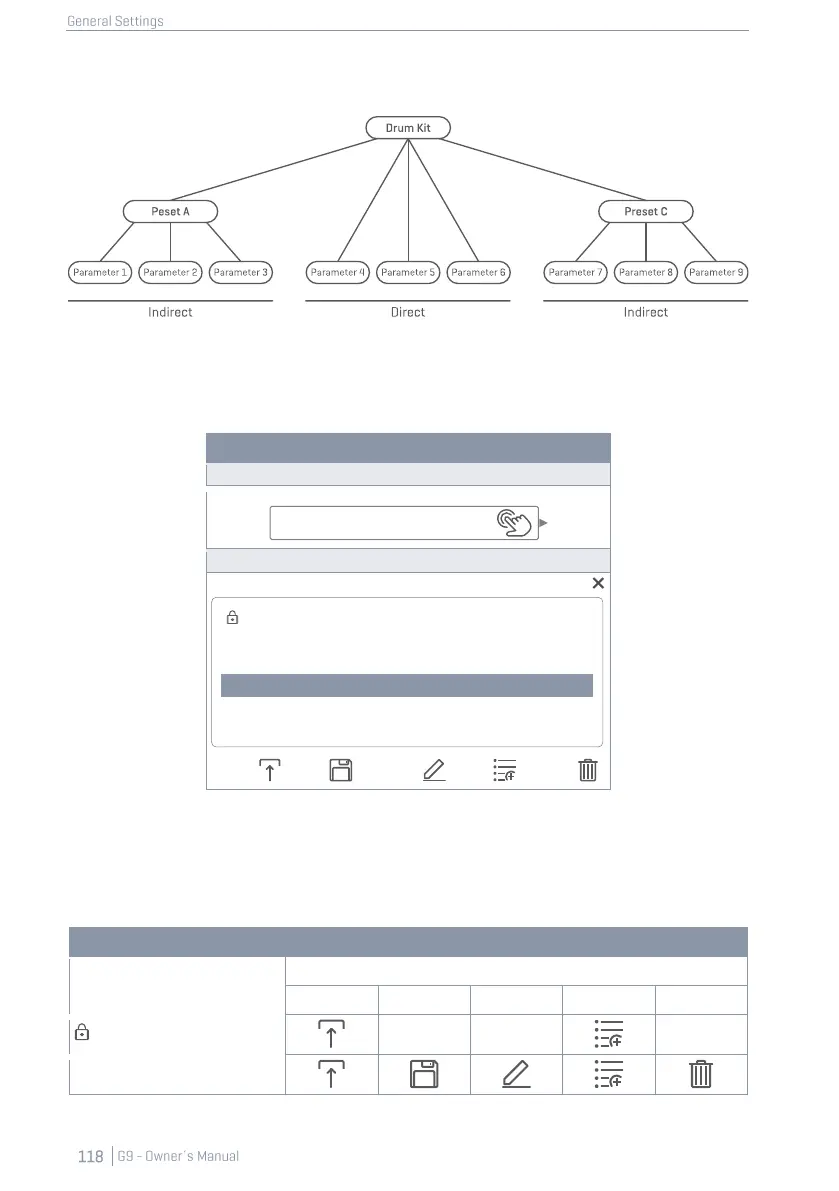 that open up by tapping on a preset field, the G9 differentiates between Factory Presets (preceding