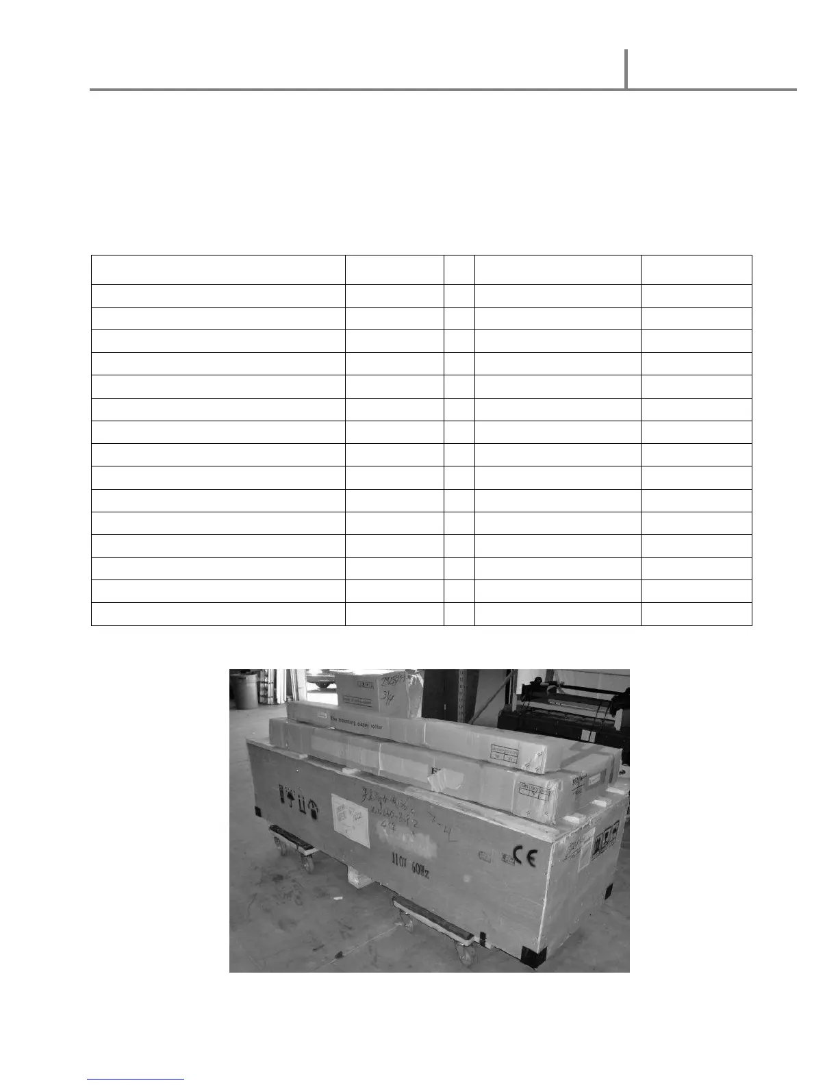 Remove all parts from shipping create and boxes. Inspect parts and the machine