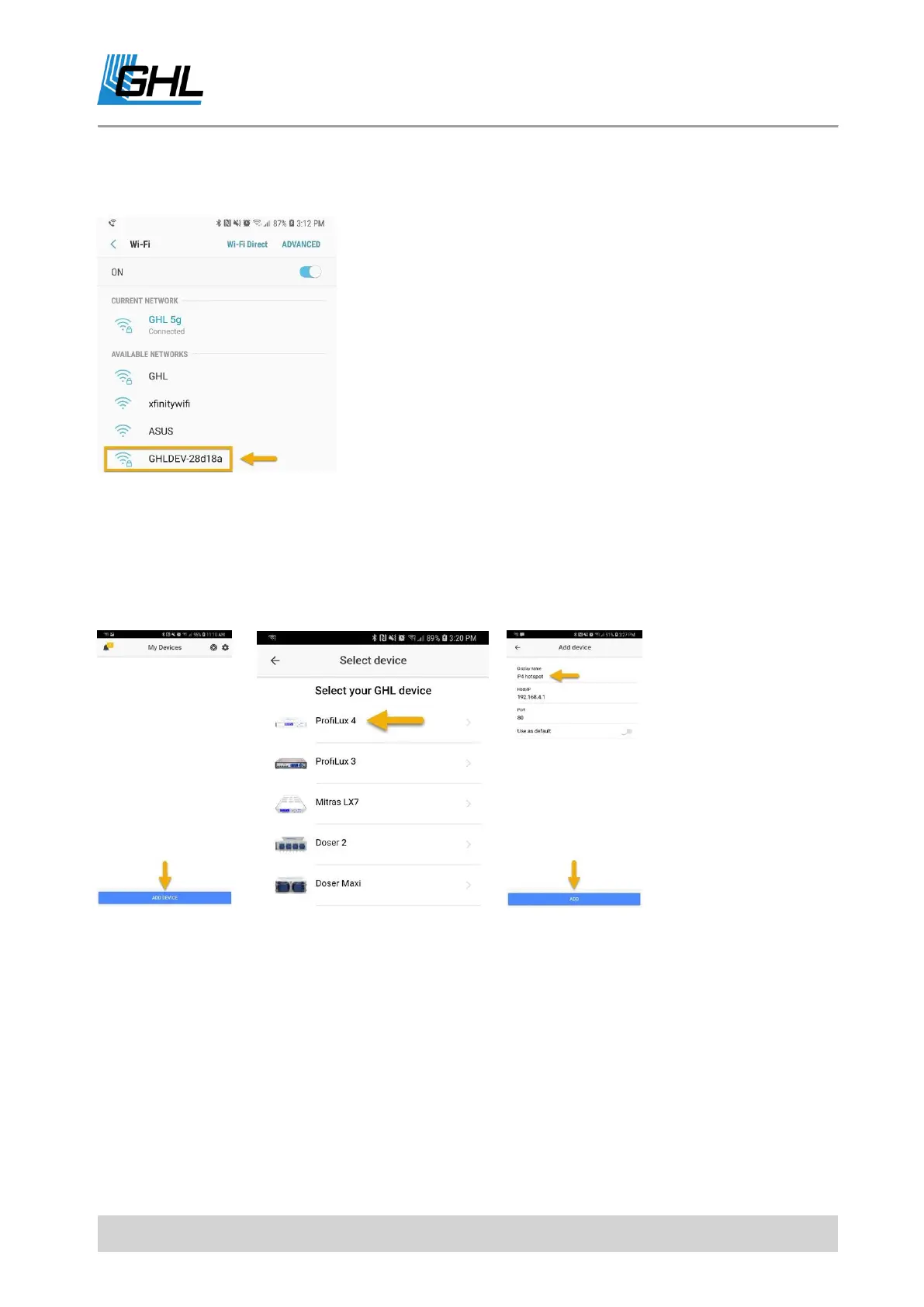 Step 3: Open GHL Connect app, select Add device, select the ProfiLux 4 / 4e, give this
