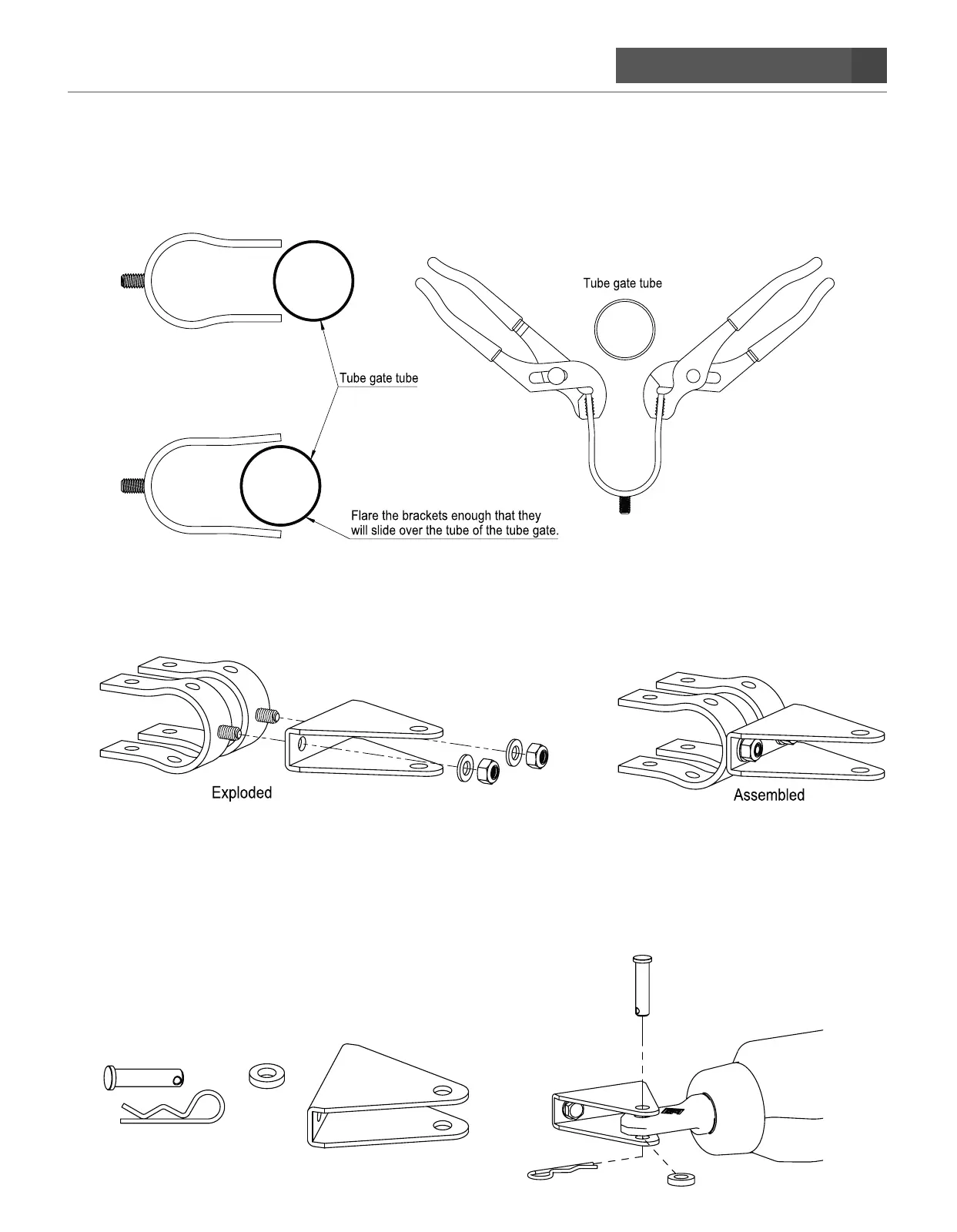 A. Before assembling gate bracket make sure the (2) tube clamp brackets fit over the tubular gate bar. If not