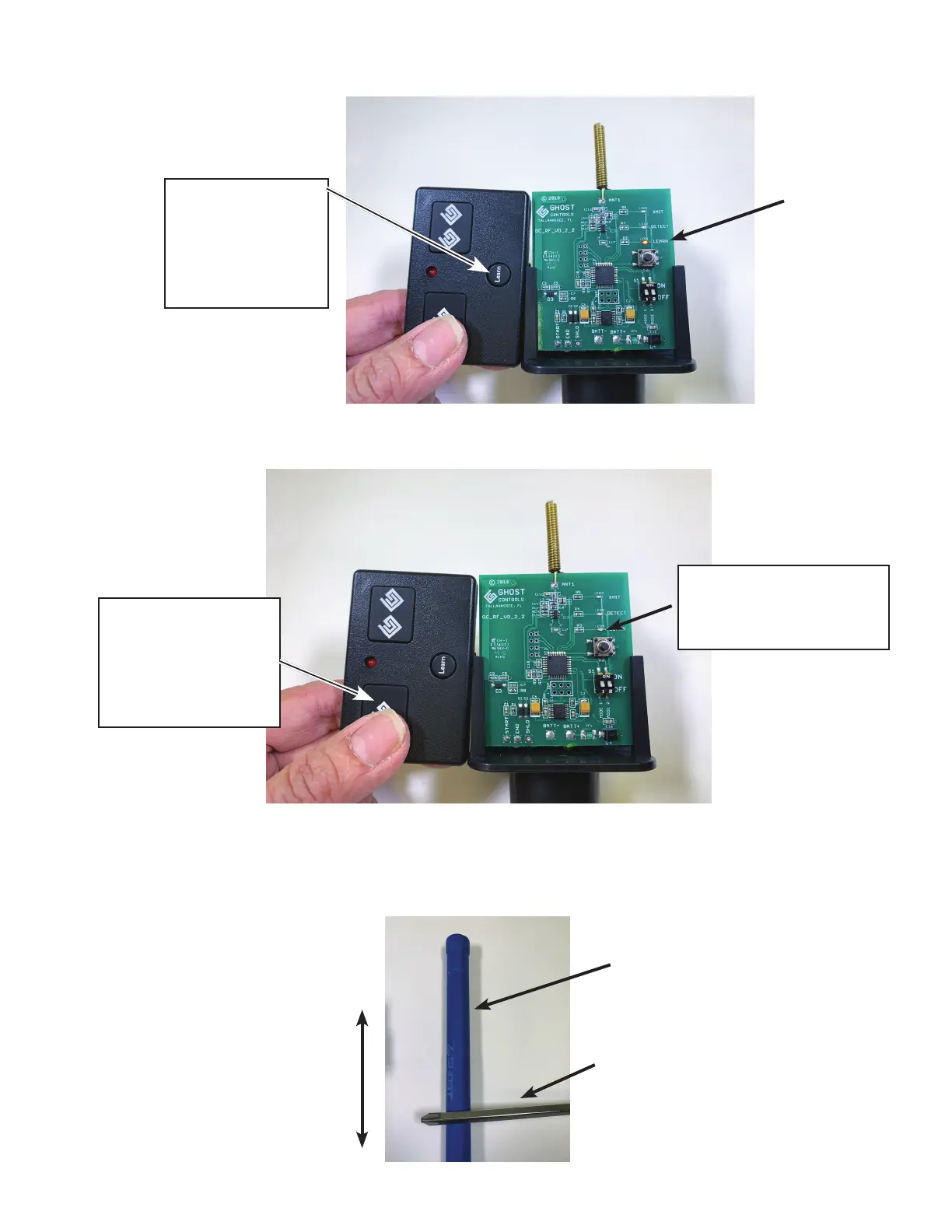 D. On the transmitter, PRESS and HOLD DOWN the button on remote transmitter (typically the large button