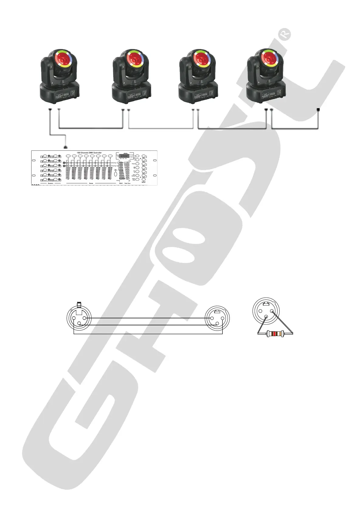 - Puis connecter la sortie DMX du projecteur à l’entrée du projecteur suivant.