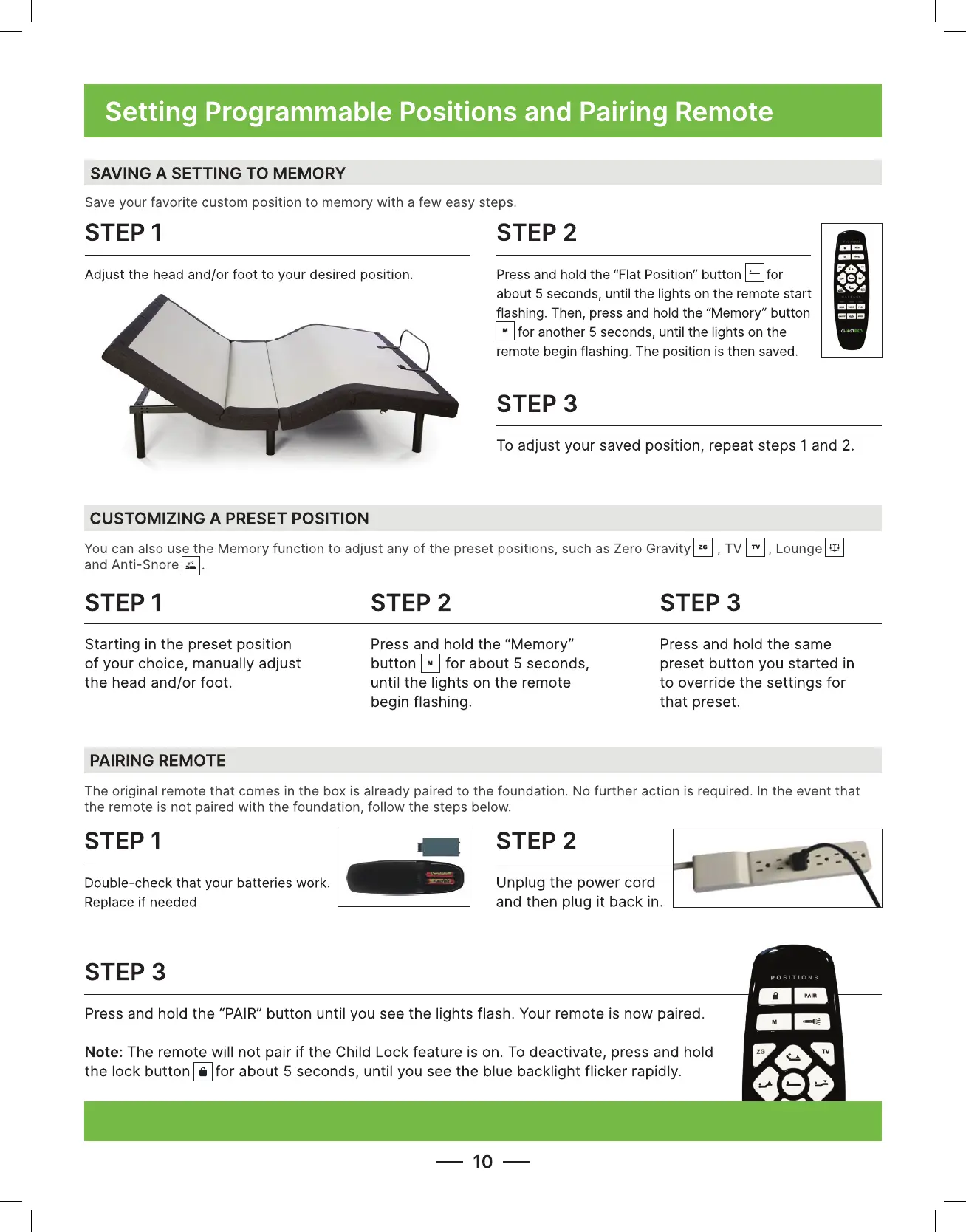 GhostBed POWER ADJUSTABLE BASE - Programmable Positions and Remote Pairing; Saving a Custom Position to Memory; Pairing the Remote Control