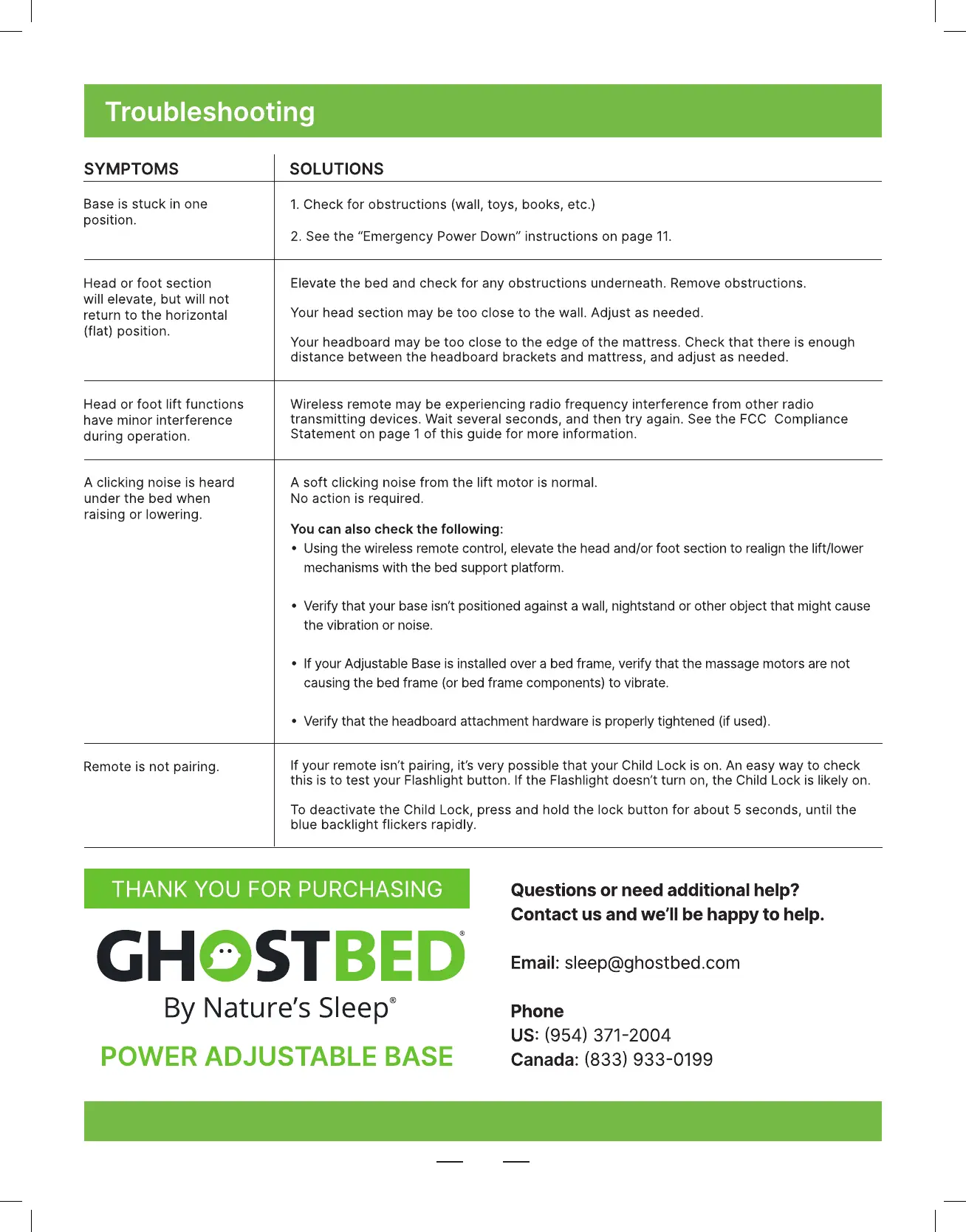 GhostBed POWER ADJUSTABLE BASE - Troubleshooting: Movement and Pairing Issues; Base Movement and Noise Issues; Remote Pairing and Child Lock