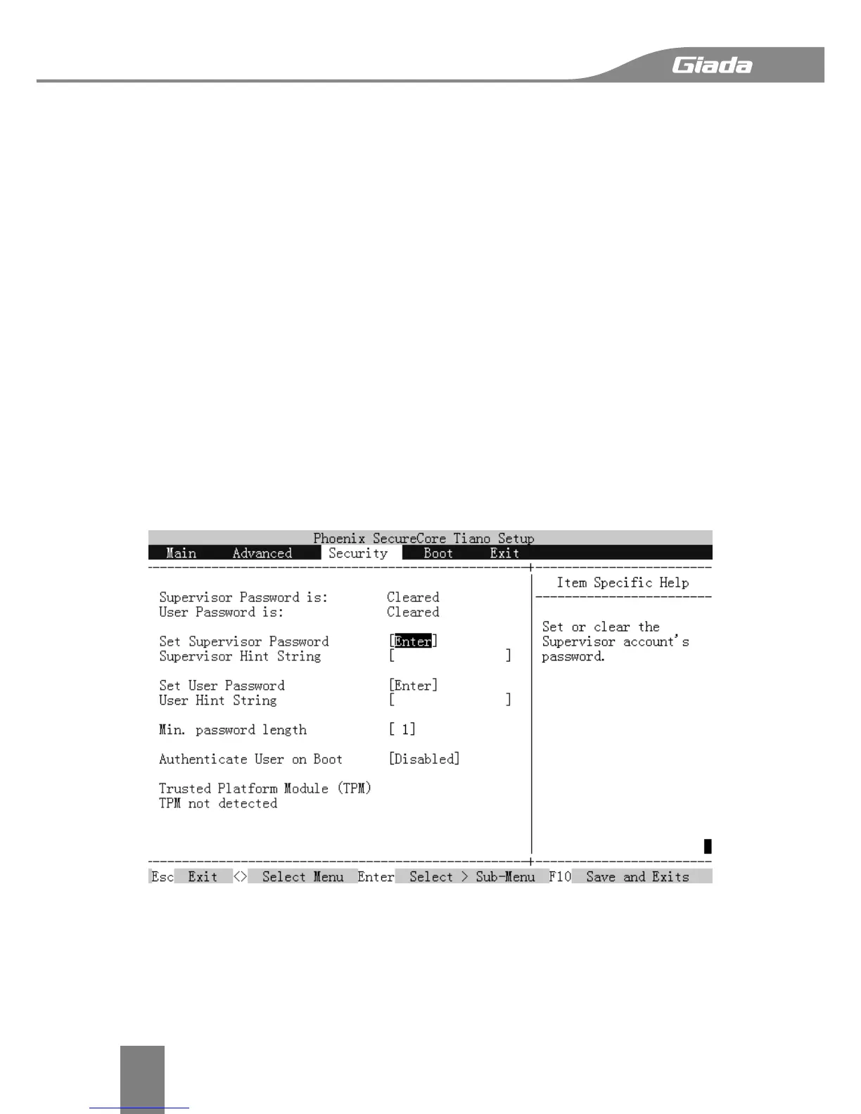 this field, a Supervisor password must first be set. A user can only access and modify the