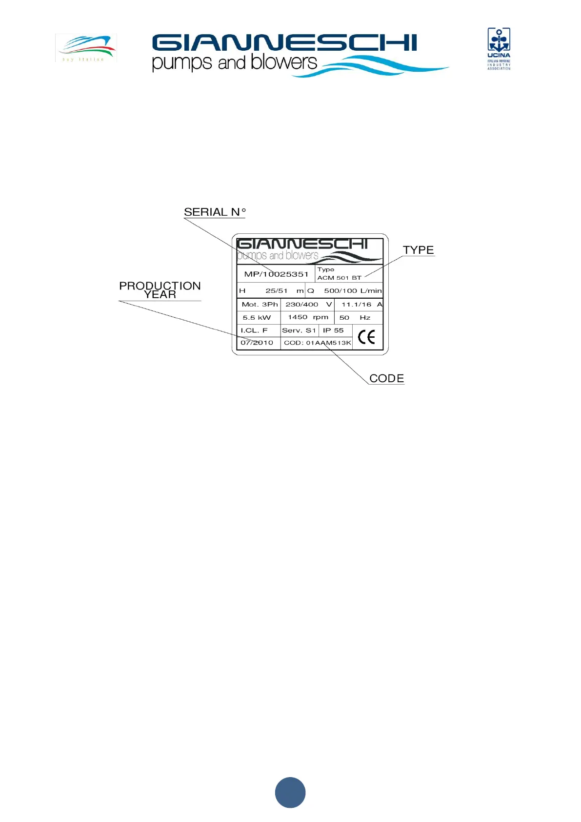 On the pump nameplate there are printed pump model, year of manufacture and pump serial