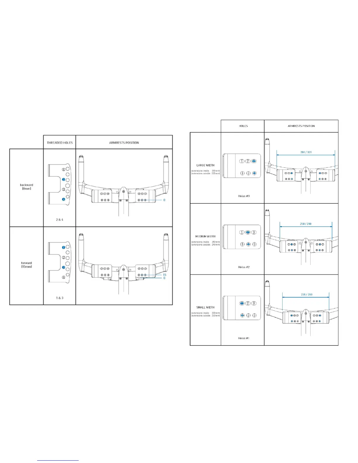 The armrest pads can be bolted onto the clamps in 2 positions.