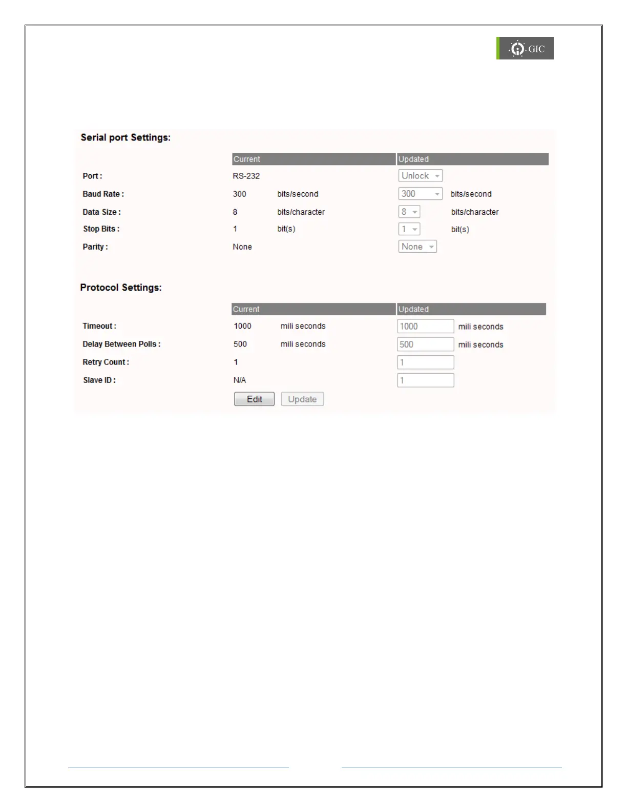 Baud Rate, Data Size, Stop Bits, Parity are the parameters to be updated from the serial