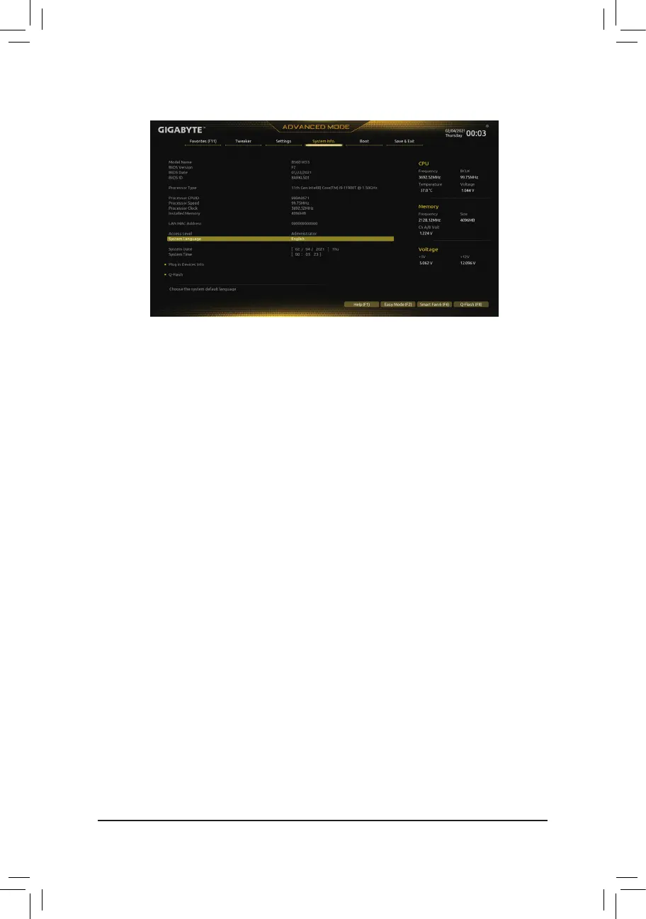 This section provides information on your motherboard model and BIOS version. You can also select the default