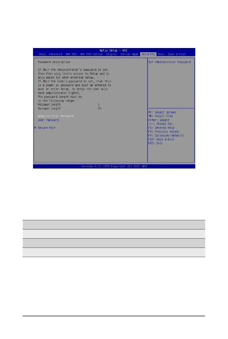 The Security menu allows you to safeguard and protect the system from unauthorized use by setting up