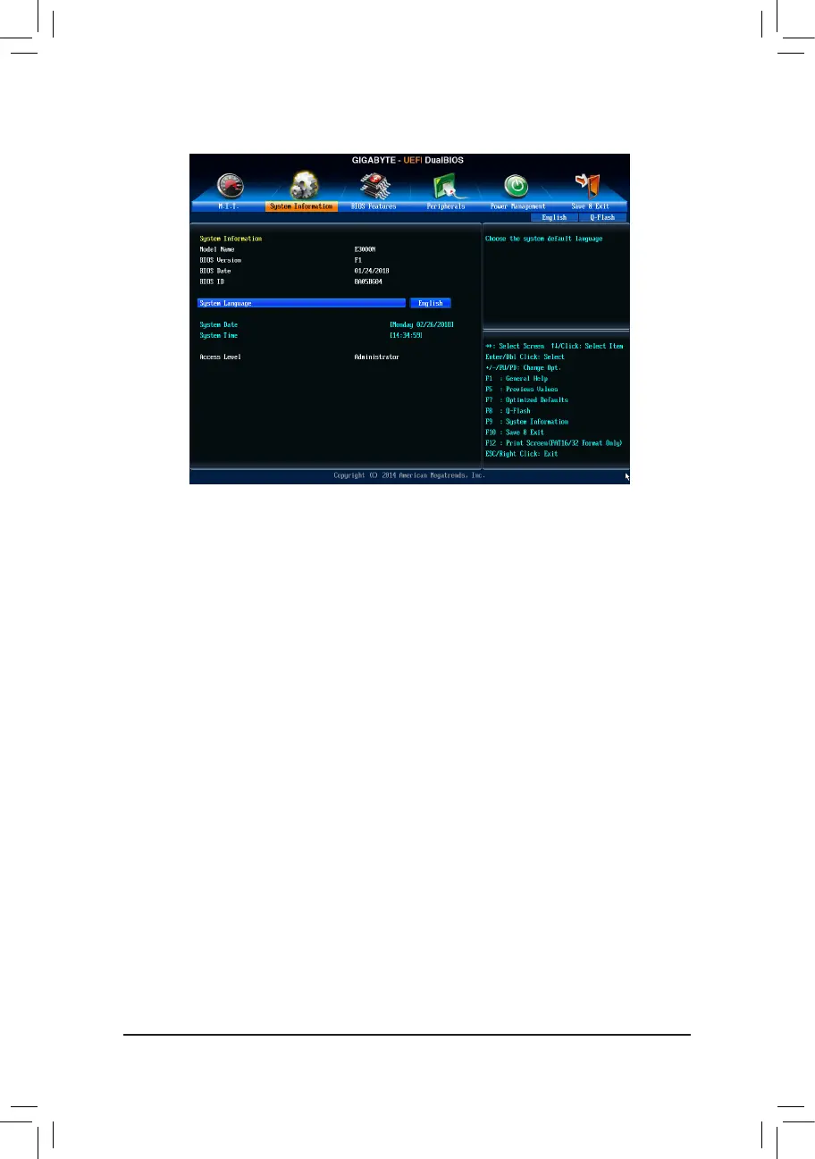 This section provides information on your motherboard model and BIOS version. You can also select the default