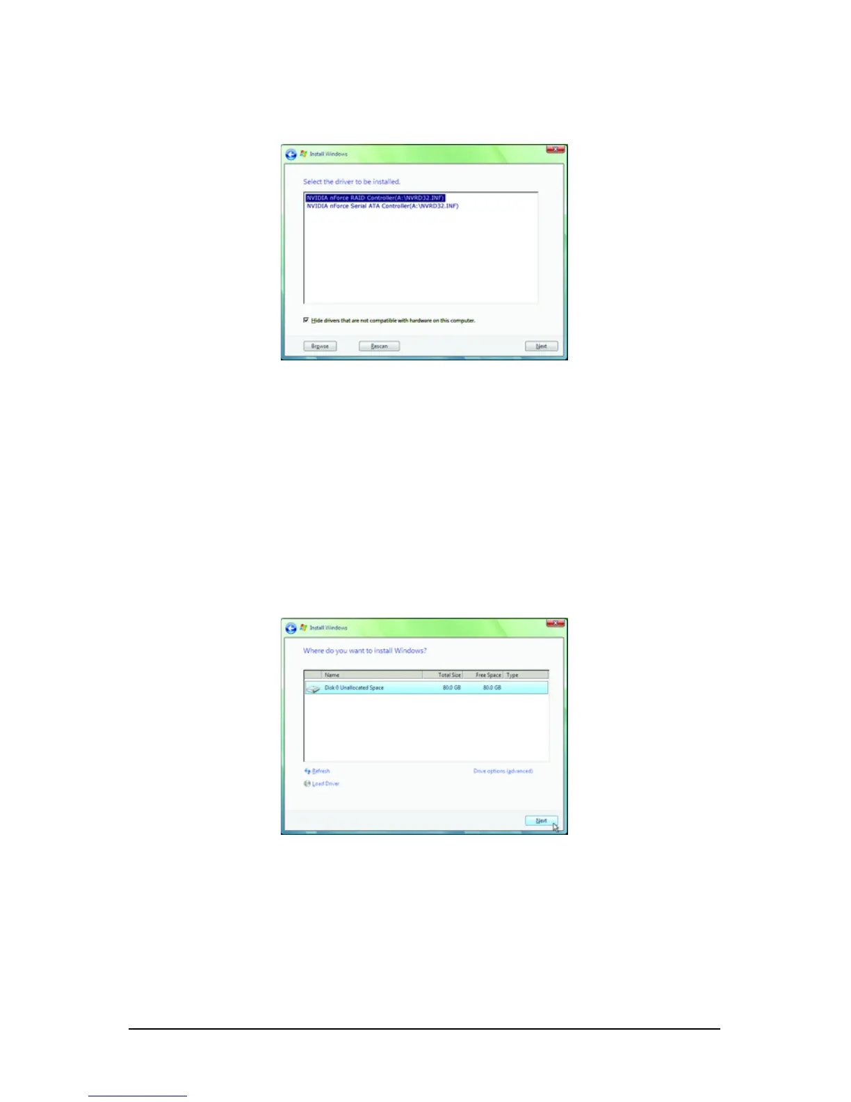 After the driver is loaded, the screen will show the RAID hard drive. Select the RAID hard drive onto