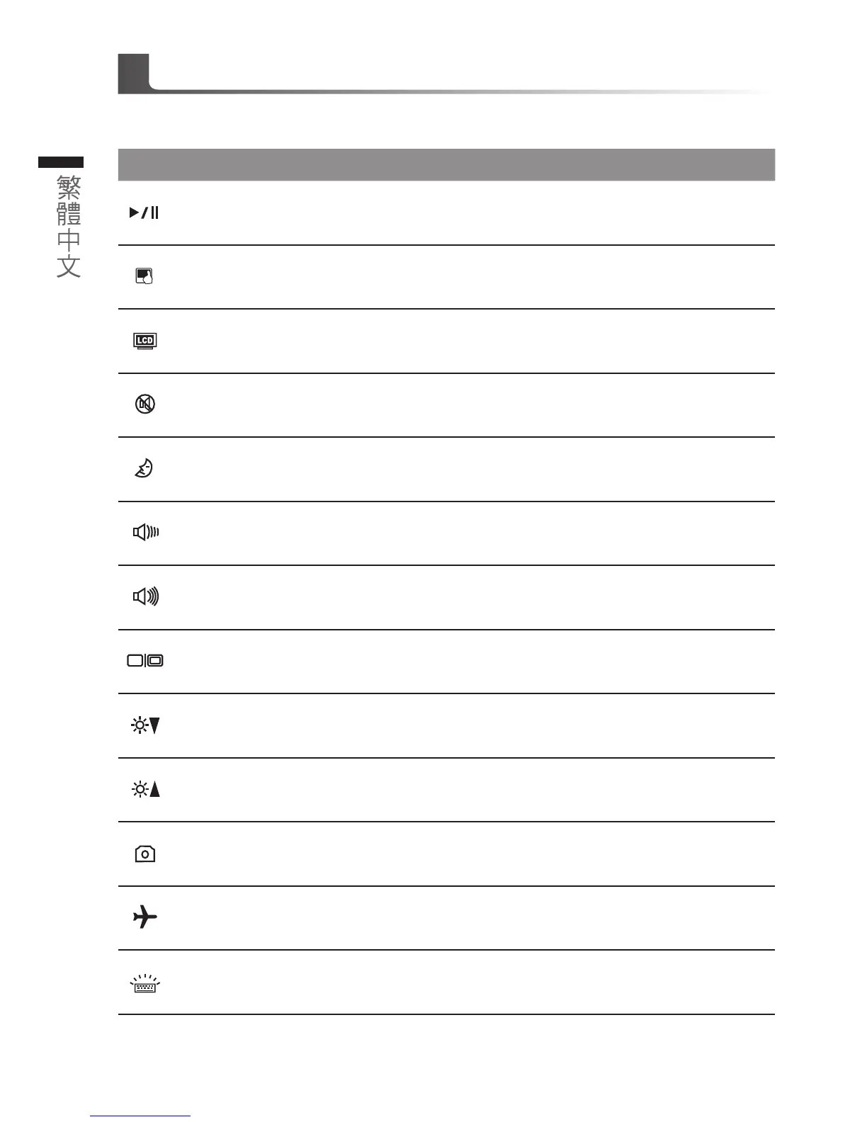 如需使用快速鍵,請依下表先按住<Fn>鍵,再按下<F1>~<F12>等按鍵。
