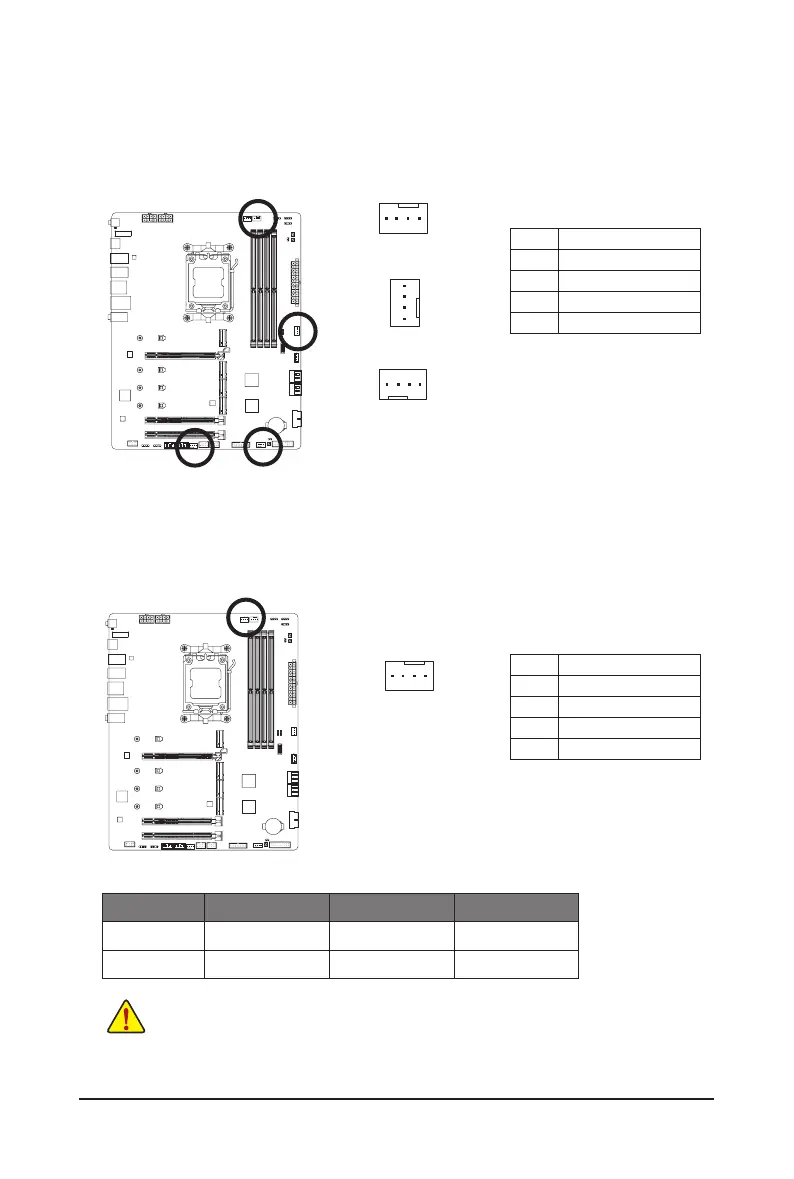 • These fan headers are not conguration jumper blocks. Do not place a jumper cap on the headers.