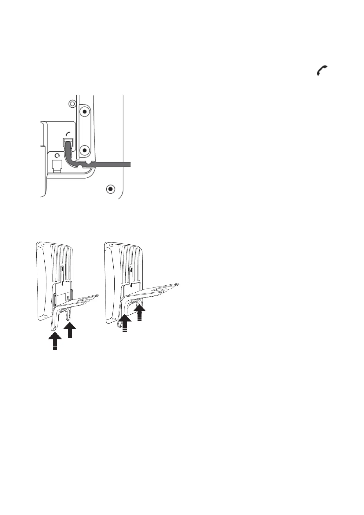 Note: Before attaching the footstand to the phone, plug the long end of the handset cord into the connector labelled " "