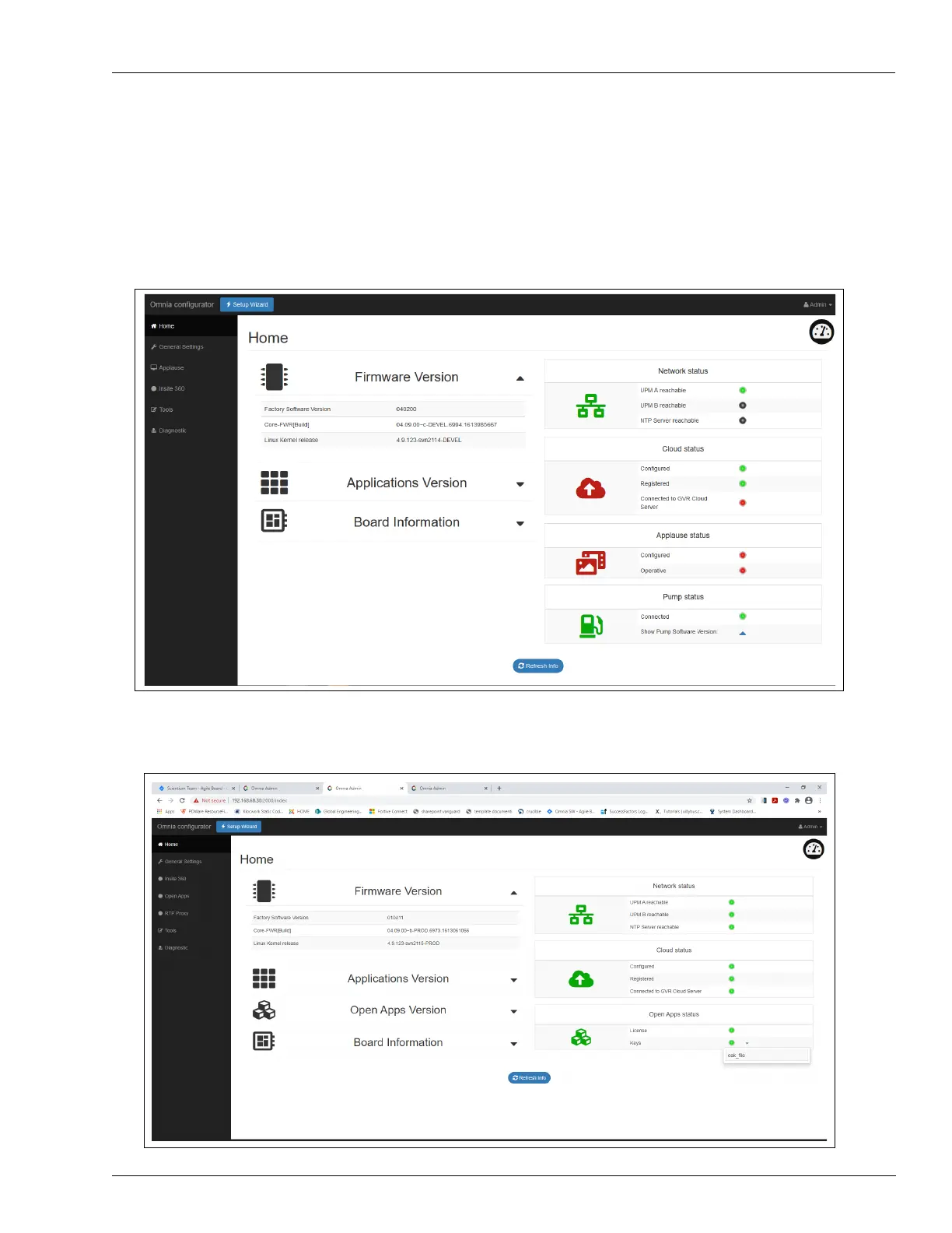 Omnia home page provides a quick overview of the software installed, hardware version