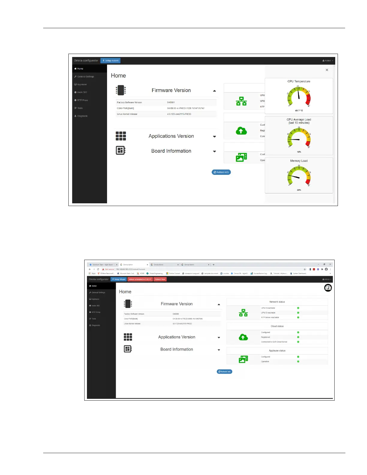 If a reboot is scheduled, a button shows the remaining time to reboot and enables the user to