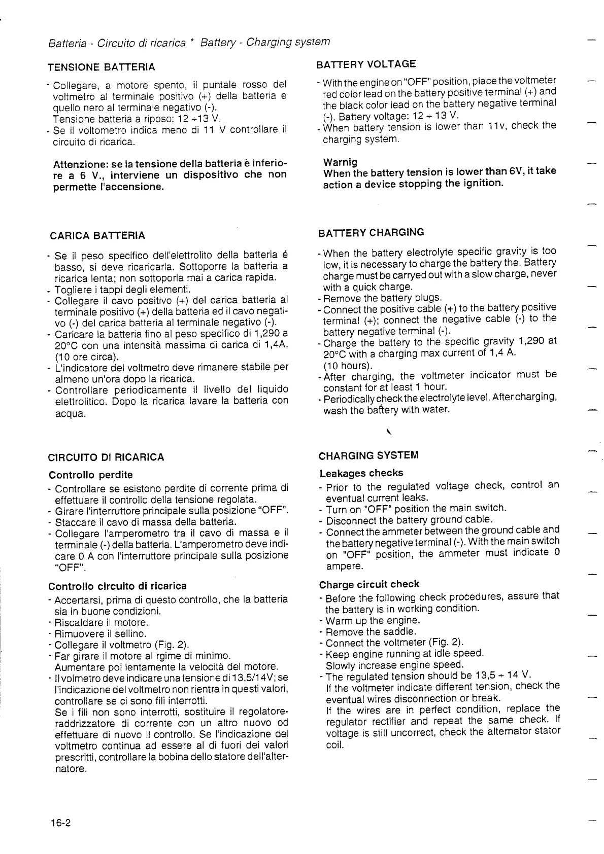 Gilera 350 - Battery Voltage; Battery Charging; Charging System; Leakages Checks