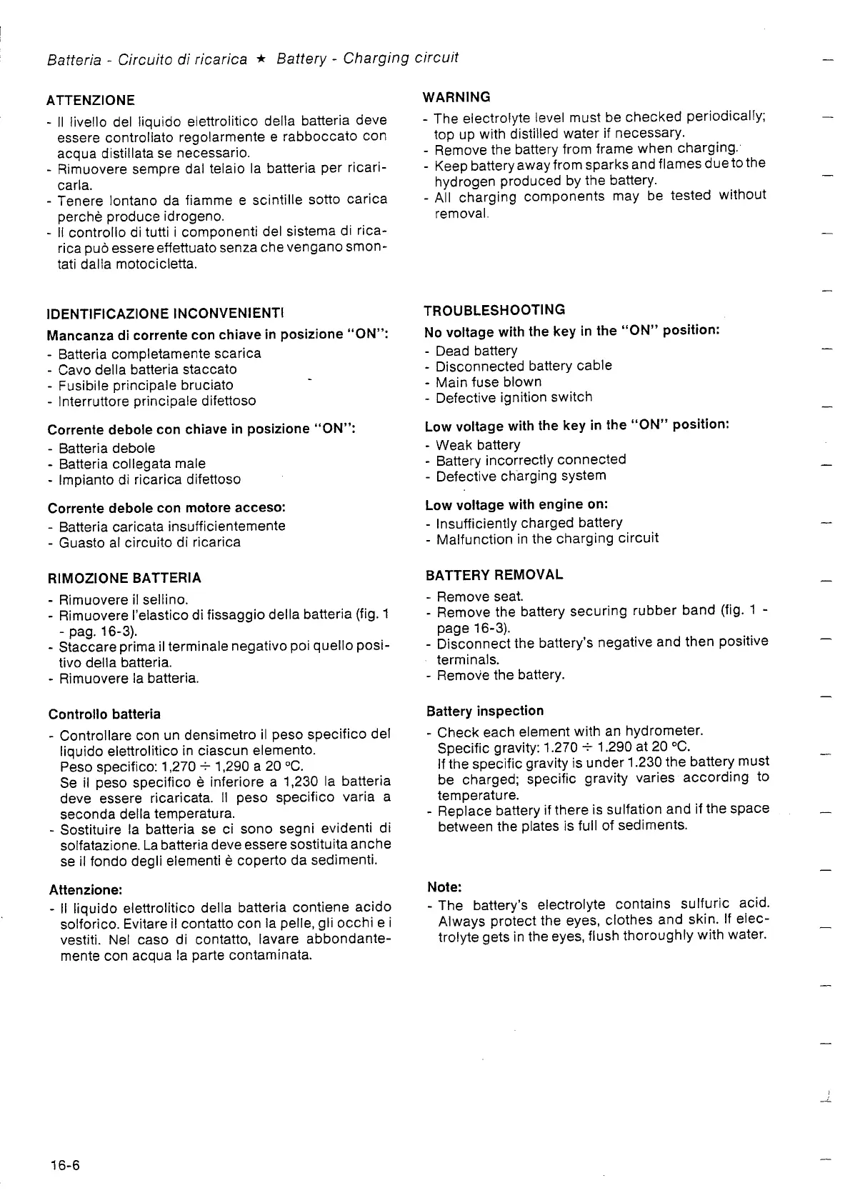 Gilera 350 - No Voltage with the Key in the on Position; Low Voltage with the Key in the on Position; Battery Removal; Battery Inspection