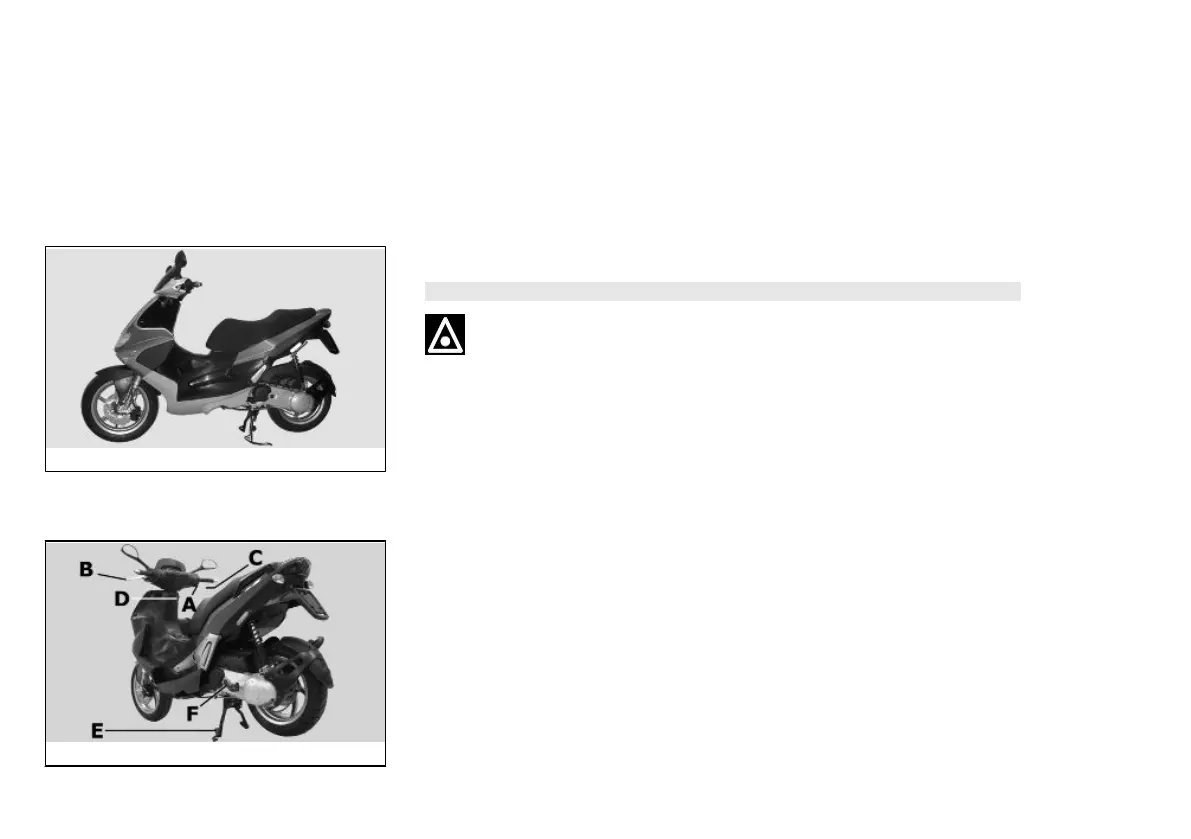 In order to start the engine, pull the right, «C», or left hand-side brake lever, «B», while