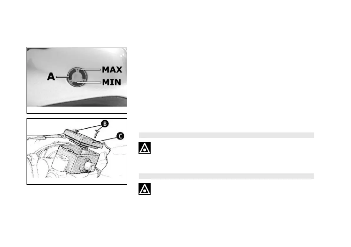 the brake reservoir cover, «C», and top up the fluid level as necessary (the level must