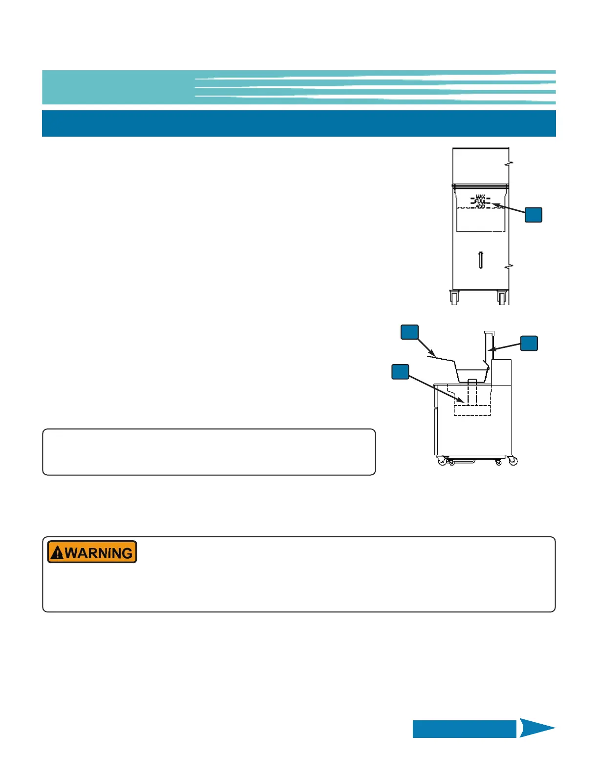 During cooking operations, oil level MUST be maintained above the indicated minimum (ADD) level. If not