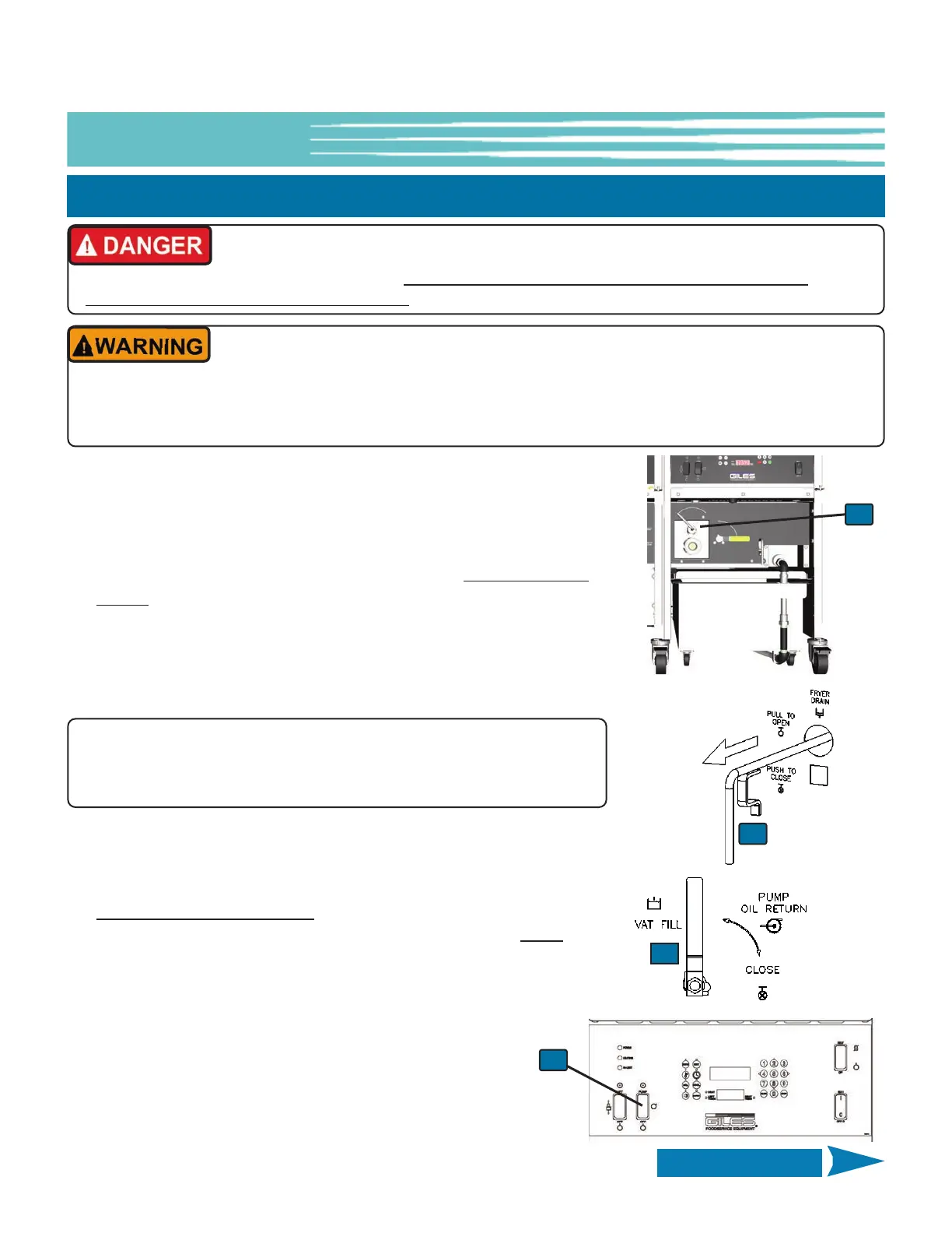 • Never drain more than one (1) vat at a time into the Filter Pan! The pan only has capacity to hold the oil from