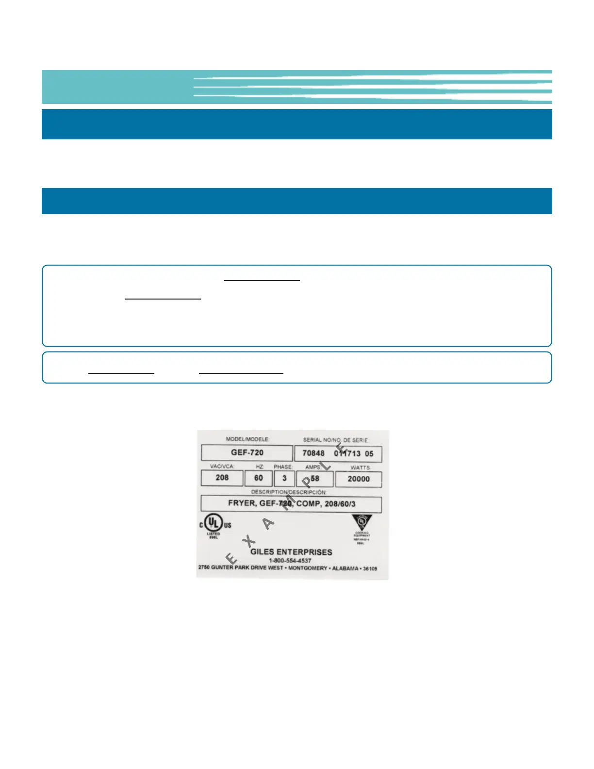 Data/Serial Label attached to the Back Panel of each Fryer unit.