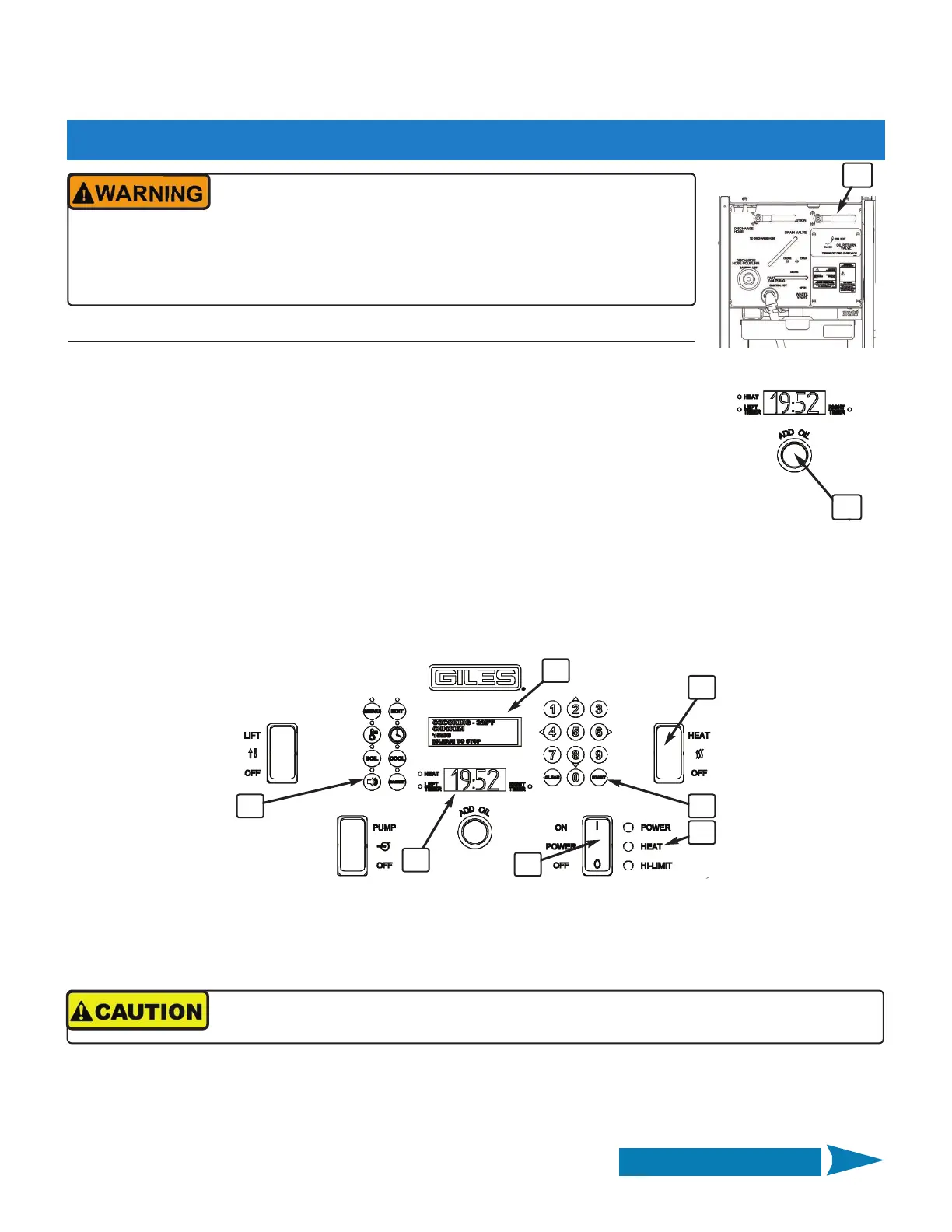B. Press & hold [ADD OIL] pushbutton ⑨ on control panel (only one panel of a banked