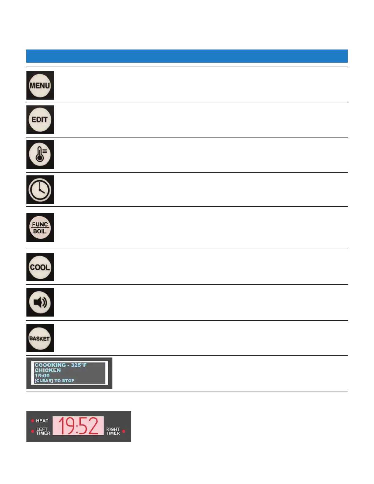 Press this key to enter COOL mode. Energy‐saving feature, allows fryer to standby with a lower oil
