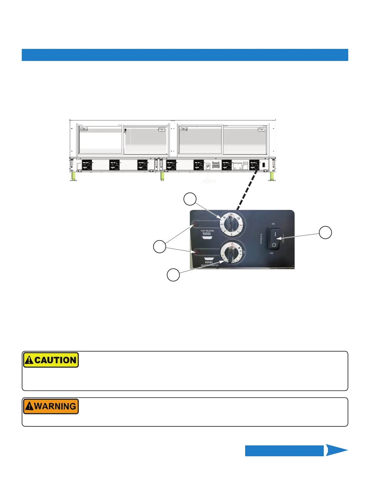 ② counter-clockwise to [HI] and set all BOTTOM HEATER controls ③ to the