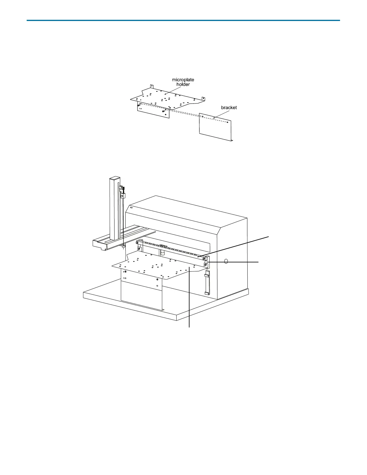 1 Align the upper set of holes (labeled B) in the microplate holder with the holes in the metal bracket. Insert the supplied