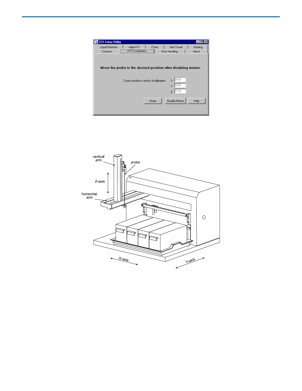 area. Finally, manually lower or raise the probe to the appropriate height. The 223 Setup Utility displays the X, Y, and Z