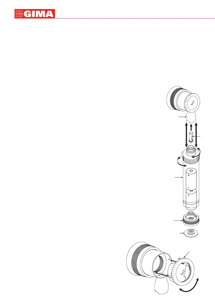 Posicionar o dermatoscópio em cima do cabo, alinhando as ranhuras com as do cabo. Empurrar