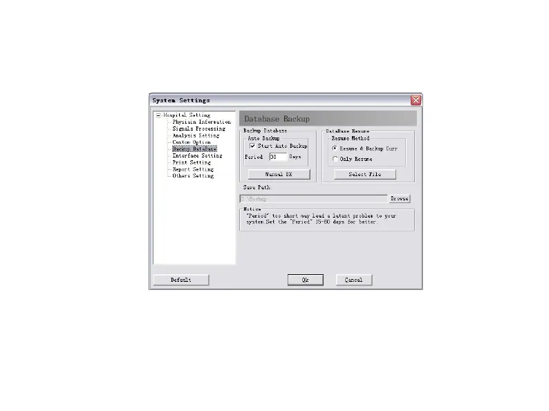 In the "Backup DataBase" (As Figure 47), you can set up auto backup time, resume methods,