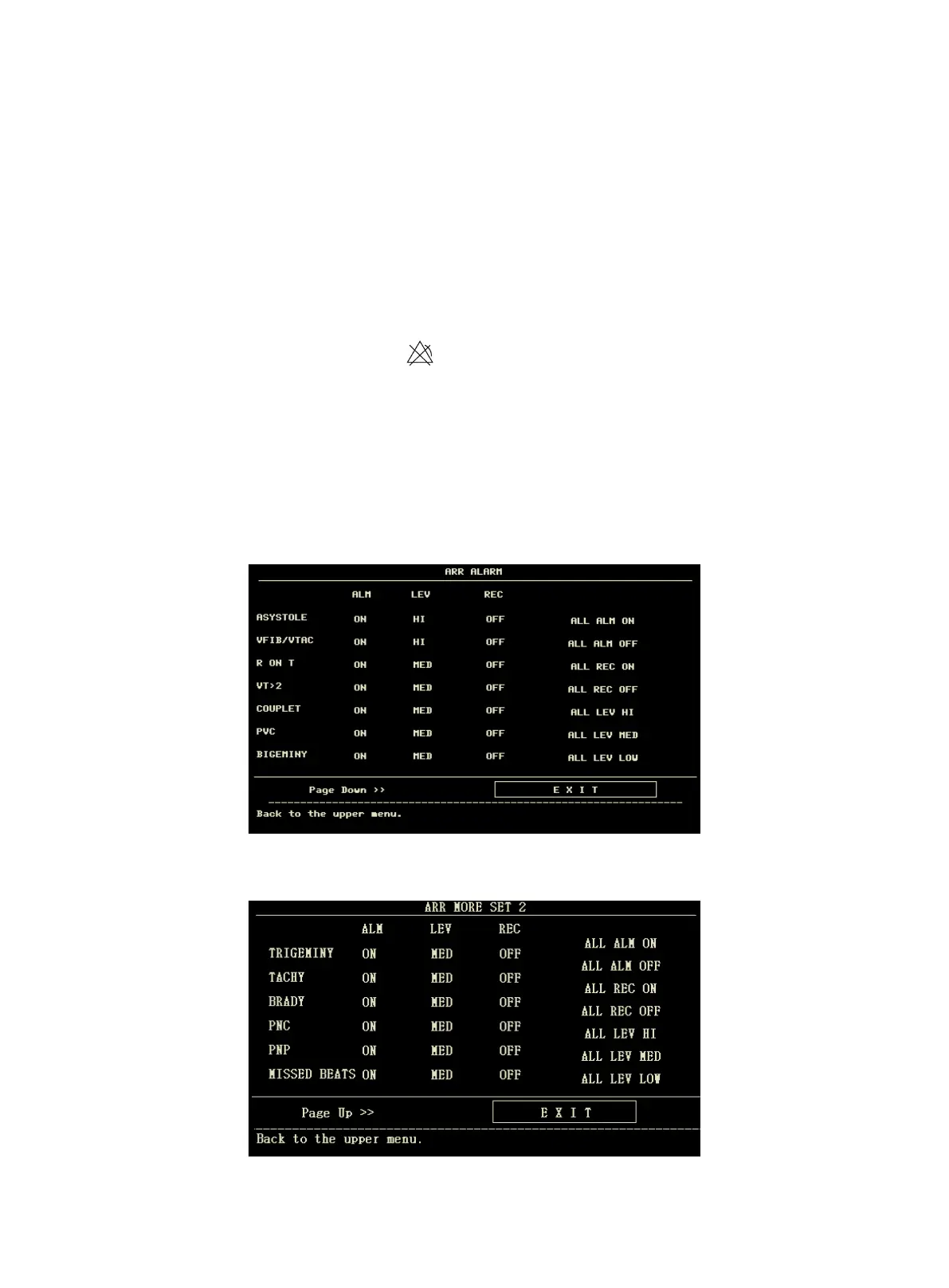 n ARR ALM SETUP: to set the arrhythmia alarm. In this menu, "ALM" is the alarm switch, "LEV" is alarm