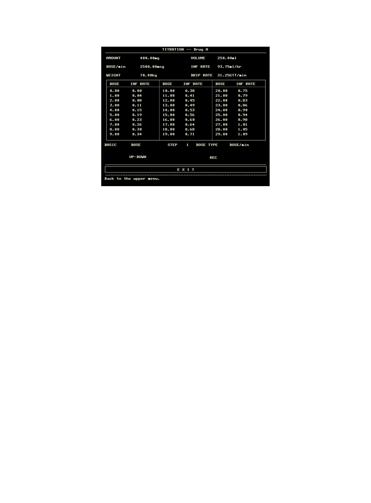 6) Portare il cursore su EXIT e premere la manopola per tornare al menù DRUG CALC.